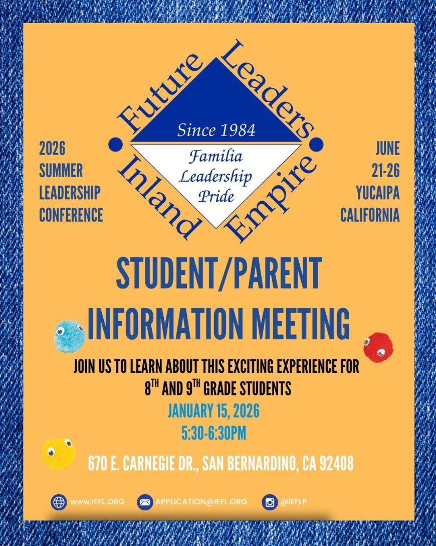 Since 1985, the Inland Empire Future Leaders Program (IEFLP) has provided summer leadership development conferences for over 4,900 Latino eighth- and ninth-grade students from throughout the Inland Empire. This year, our leadership conference will be in person! The five-day conference includes training in leadership, campaign processes, cultural awareness, college preparation, career choices, citizenship responsibilities, financial literacy, and public speaking. The sessions are dynamic, intensive and fun-filled, but more importantly, we encourage students to strive for academic excellence and to contribute to their schools and community through personal involvement.